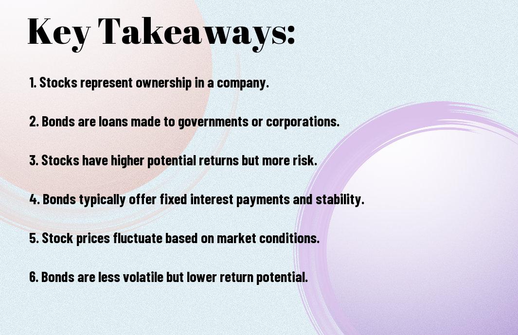 Upon reflecting on the differences between stocks and bonds, it’s imperative for you to understand how each investment contributes uniquely to your portfolio. Stocks typically offer growth potential through ownership in a company, while bonds provide stability and predictable income through debt instruments. By familiarizing yourself with these key distinctions, you can make more informed decisions about your investment strategy. For a deeper look into stocks, check out Stocks: What They Are, Main Types, How They Differ From ….